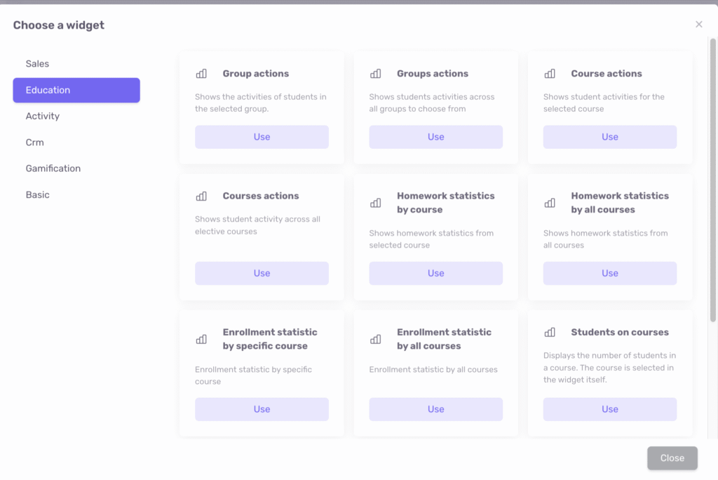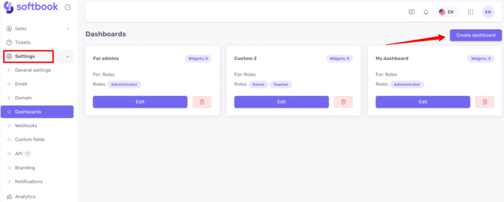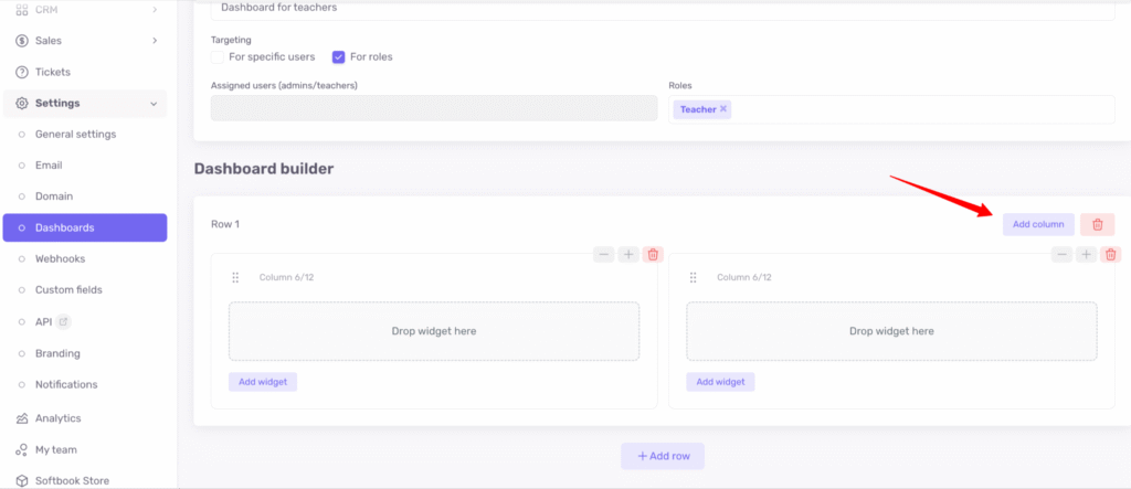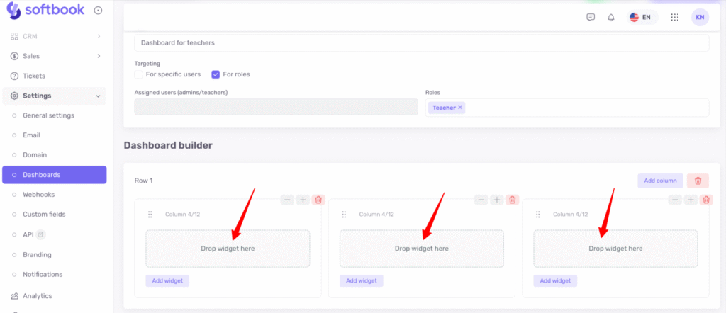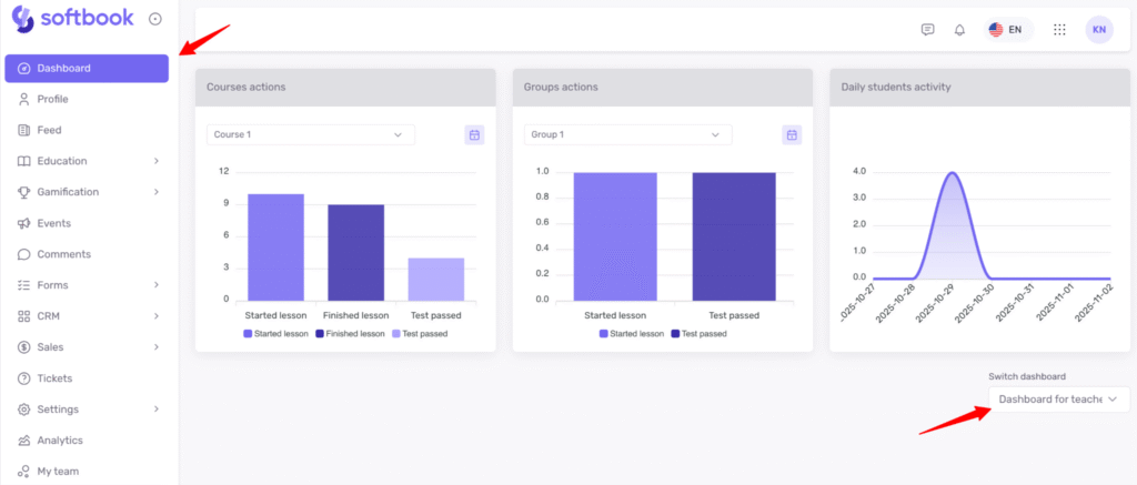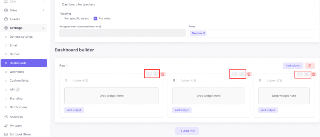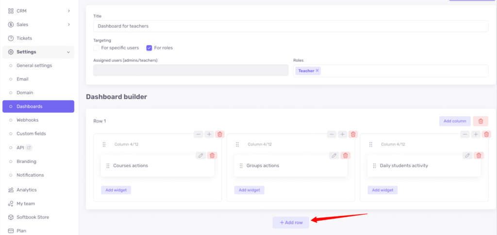 In Softbook LMS, you can create your own custom dashboards for different roles (except students) or for specific users among administrators, teachers, or the owner.