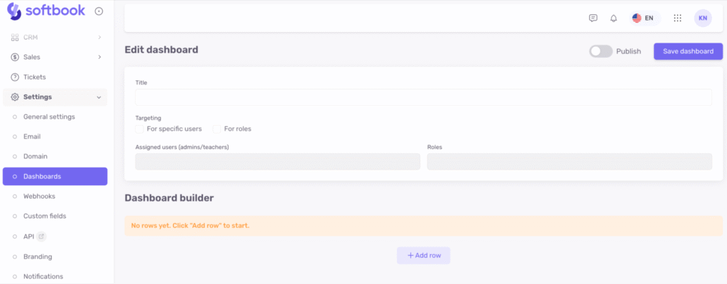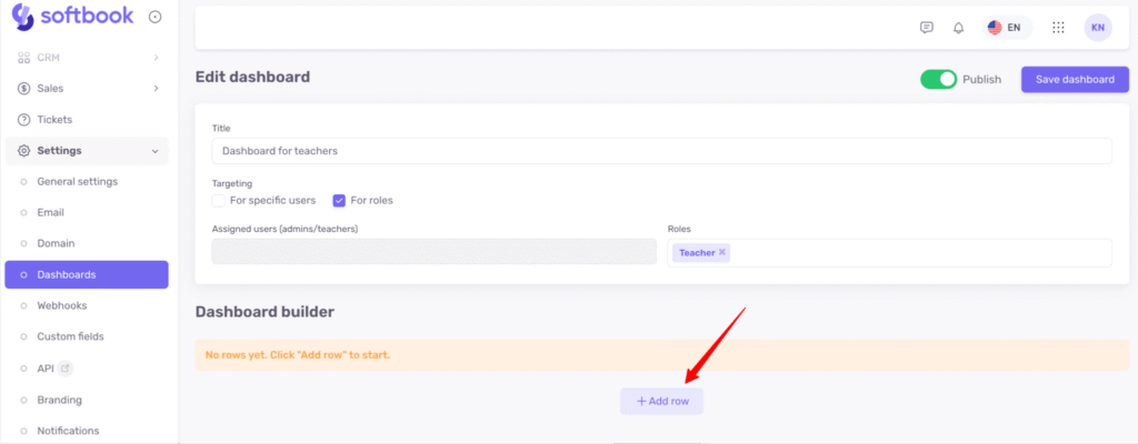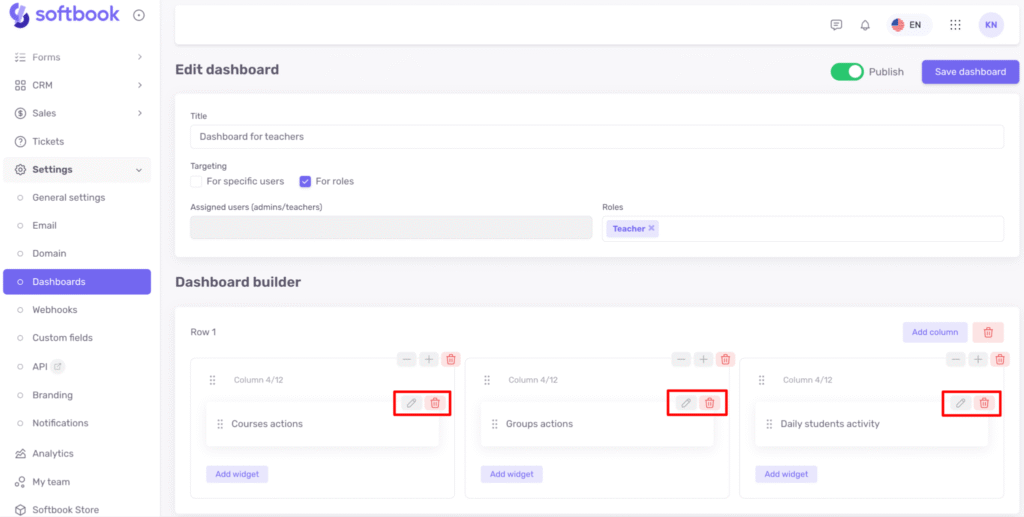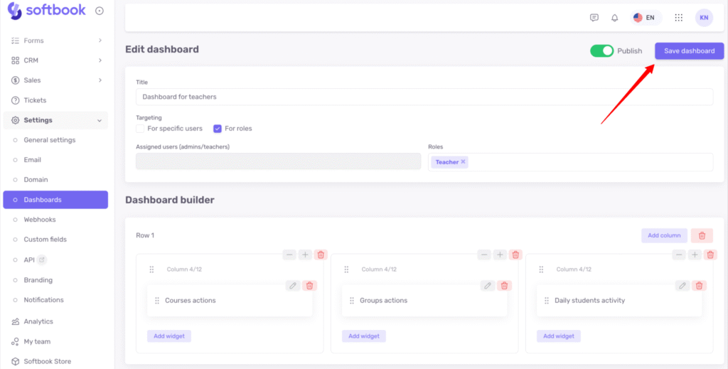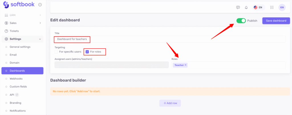 Let’s look at an example. Suppose you want to create a custom dashboard for the Teacher role. Enter the dashboard name, select “For roles”, and in the role list choose “Teachers.” Then activate toggle Publish.