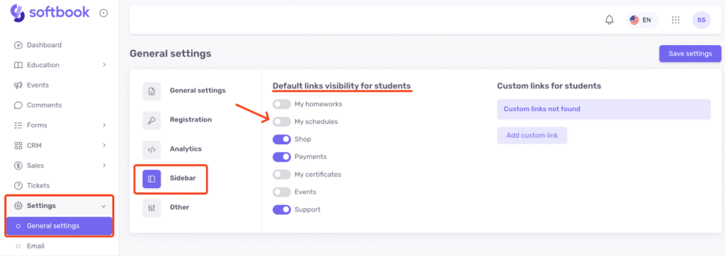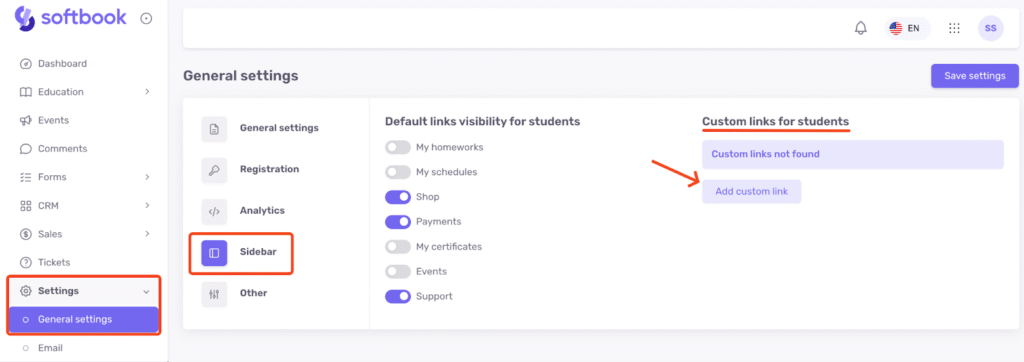 В настройках боковой панели вы можете скрыть ненужные стандартные ссылки и добавить собственные, которые ведут, например, на внешние ресурсы, дополнительные материалы или другие разделы платформы.