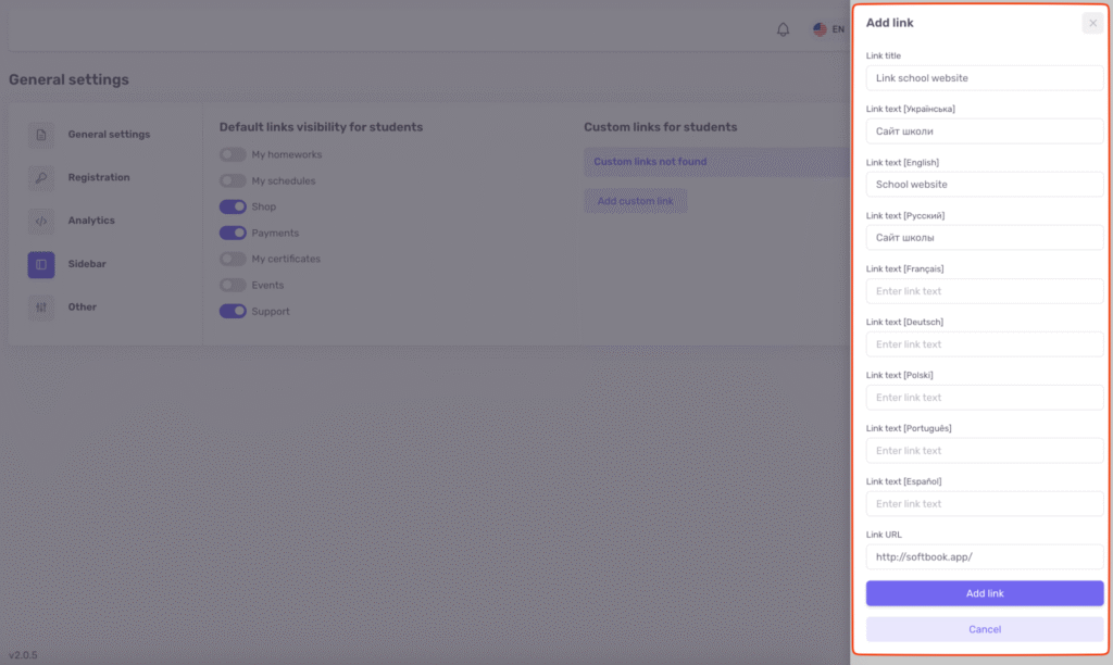 - Текст ссылки — названия ссылки для студентов. Можно задать для 8 языков, поддерживаемых платформой: Украинский, Английский, Русский, Французский, Немецкий, Польский, Португальский, Испанский.