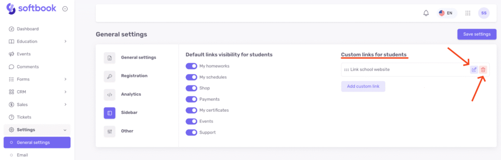 Добавленные пункты отобразятся в списке Пользовательские ссылки для студентов, где вы можете изменить их, нажав на иконку карандаша, или удалить, кликнув на иконку корзины.