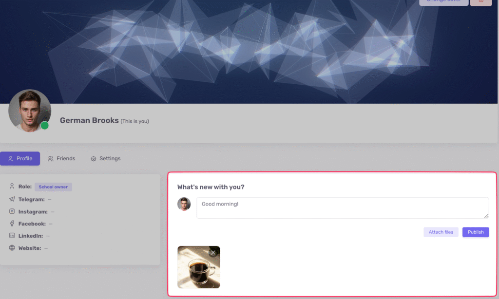 Профиль — это персональная страница пользователя внутри школы. На странице профиля отображаются основные данные, включая имя пользователя, фотографию и обложку, роль на платформе, а также ссылки на социальные сети и веб-сайт пользователя.