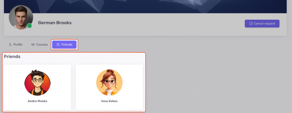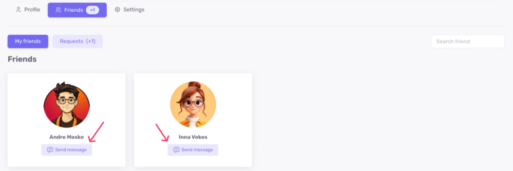 Во вкладке «Мои друзья» отображаются подтвержденные друзья, а во вкладке «Запросы» — ожидающие подтверждения запросы.