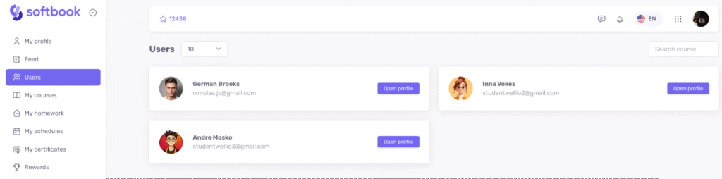 Для того чтобы участники могли видеть друг друга и взаимодействовать, в настройках раздела “Социальная сеть” необходимо включить опцию «Включить страницу со всеми пользователями в школе». После активации в боковой панели появится пункт «Пользователи», где будут отображаться все участники школы.