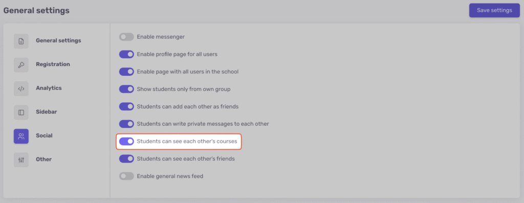 Для того чтобы студенты могли просматривать курсы других участников, необходимо в разделе “Социальная сеть” активировать параметр «Студенты могут просматривать курсы других студентов».