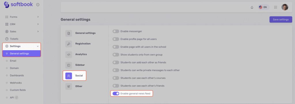 Щоб увімкнути стрічку, перейдіть у розділ «Налаштування» → «Загальні налаштування» → «Соціальна мережа» та активуйте опцію «Увімкнути новинну стрічку».
