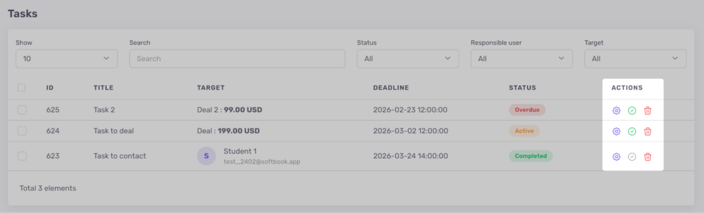 Розділ «Задачі» призначений для контролю роботи з контактами та угодами в CRM-системі вашої онлайн-школи. Тут відображаються всі задачі, створені з карток контактів та угод.